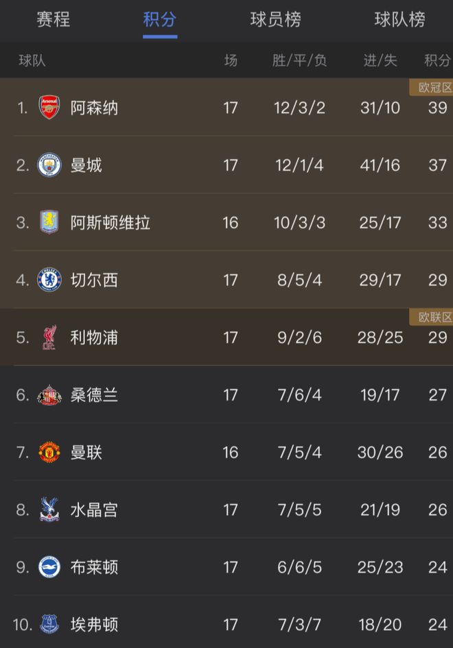 不过稍后登场的领头羊阿森纳顶住压力,他们在客场凭借埃弗顿送出的点球大礼,由哲凯赖什主罚命中制胜,以1-0力挫实力不俗的埃弗顿,各项赛事3连胜。17轮后积39分,继续以2分优势力压曼城,领跑英超积分榜。由于本轮也是圣诞节前最后1轮比赛,阿森纳成功摘得本赛季英超“圣诞冠军”。