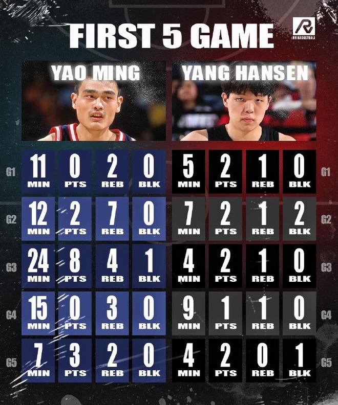 第1场小杨只拿到2分之后,很多人还把他和姚明进行了对比,那么杨瀚森对比姚明,在生涯前5场比赛里的数据究竟如何?现在也是有媒体带来了一个重磅的揭秘,看一看杨瀚森是否能够和姚明进行pk。