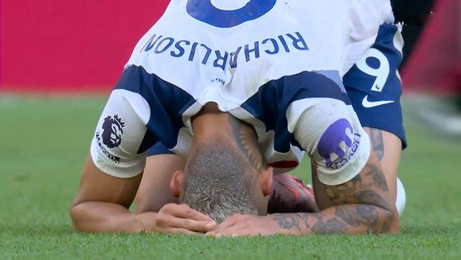 补时阶段的第一分钟,热刺角球发出来,奥多贝尔兜射,禁区内的里沙利松头球蹭到,直入死角,2:1!进球后的里沙利脱衣庆祝,流下了激动的泪水!这也是完全可以理解的,毕竟他已经多场比赛没有得分,完全释放压力。
